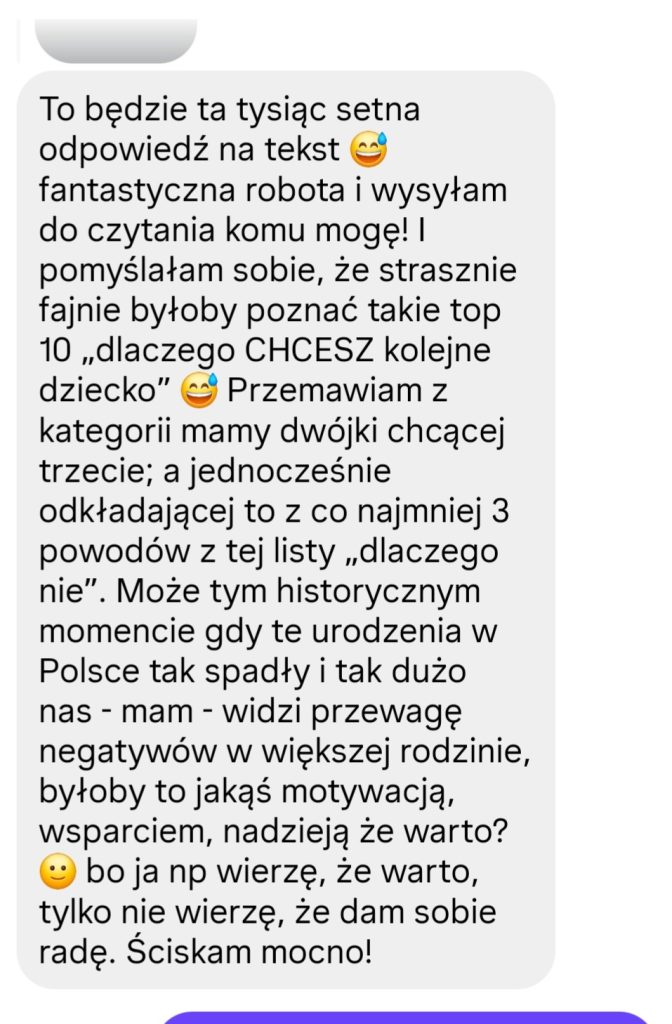 „Wypowiem się z poziomu matki trójki, która po dwójce miała wątpliwości – ze względu na kilka punktów w artykule o powodach „na nie”. Jednak najsilniejszą motywacją było poczucie, że nie jesteśmy jeszcze w komplecie, i że do końca życia będę żałować, a ja bardzo nie lubię żałować, że czegoś nie zrobiłam.”